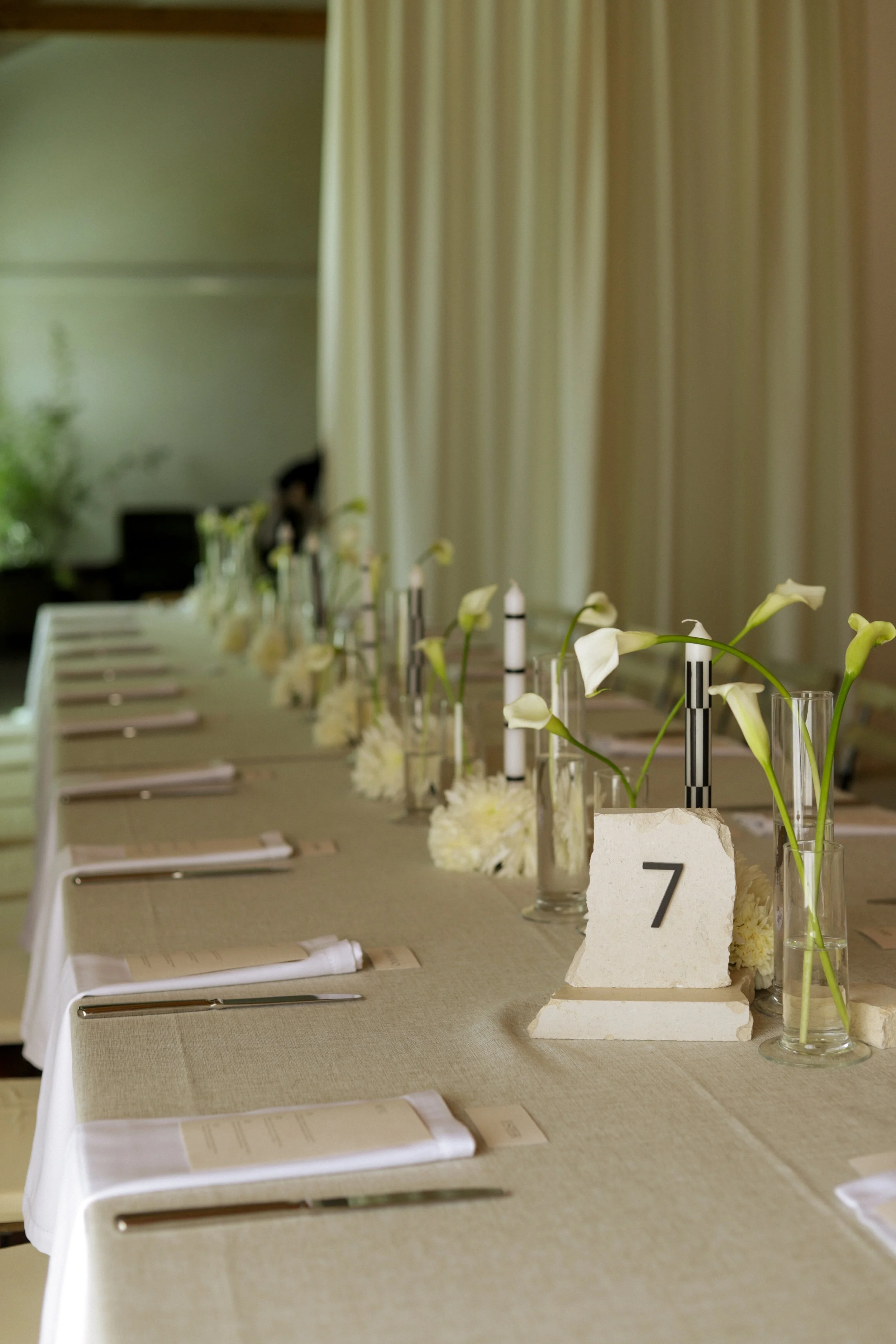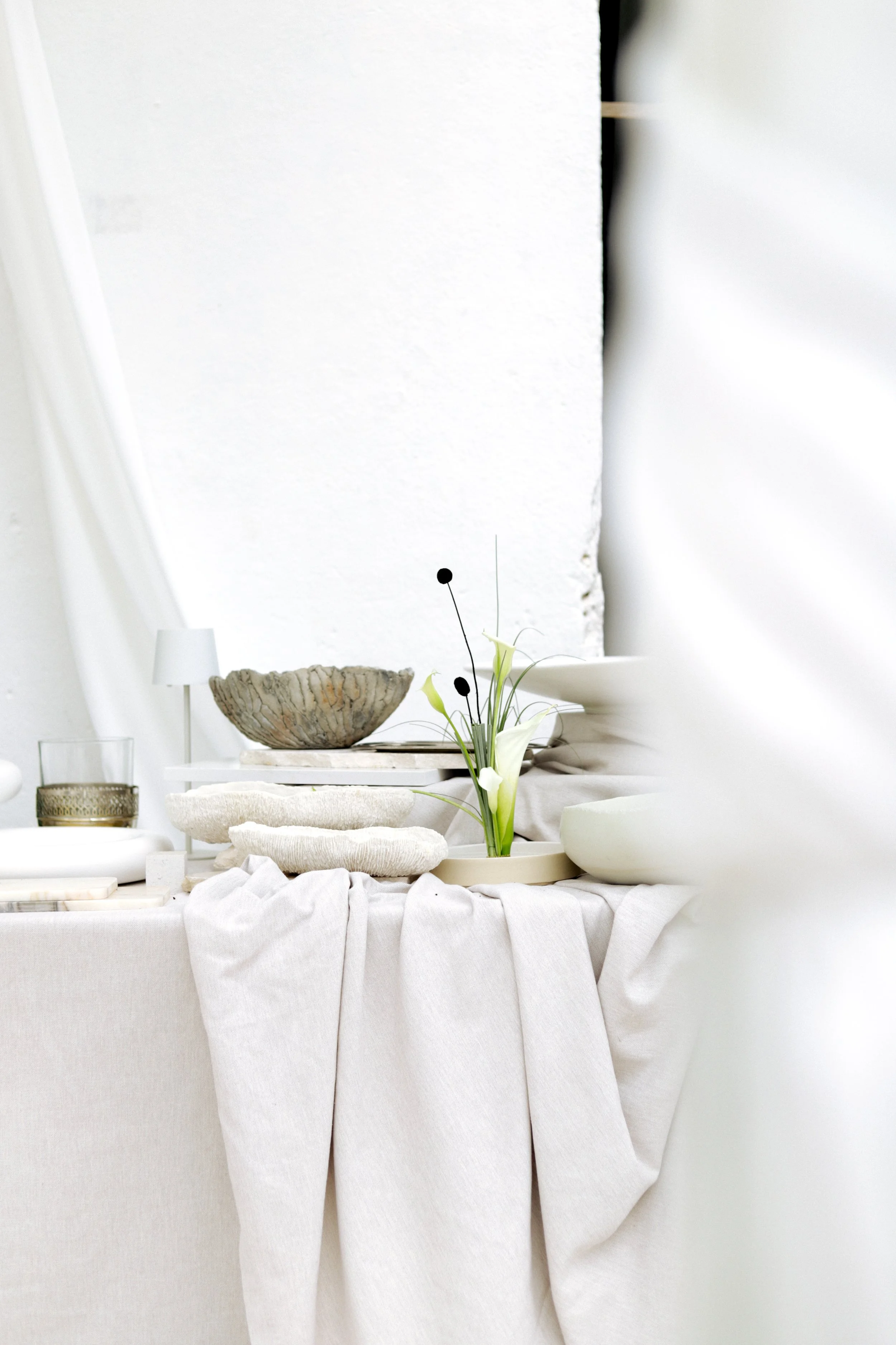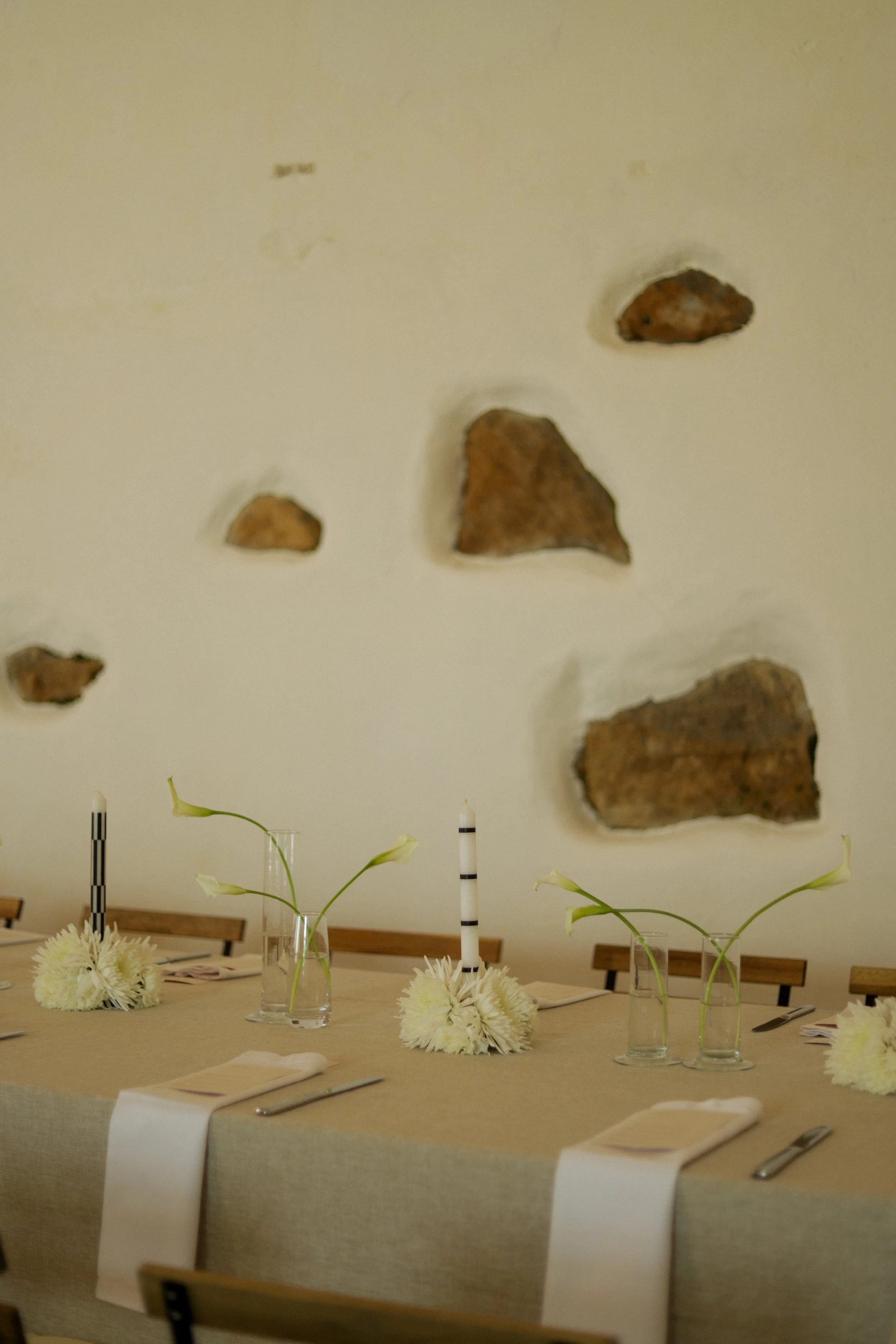 Para as mesas pretendemos equilibrar sobriedade e expressão, através da relação subtil entre luz, sombra e textura. A luz das velas acentua o jogo de contrastes e convida ao convívio num ambiente que é simultaneamente sereno.