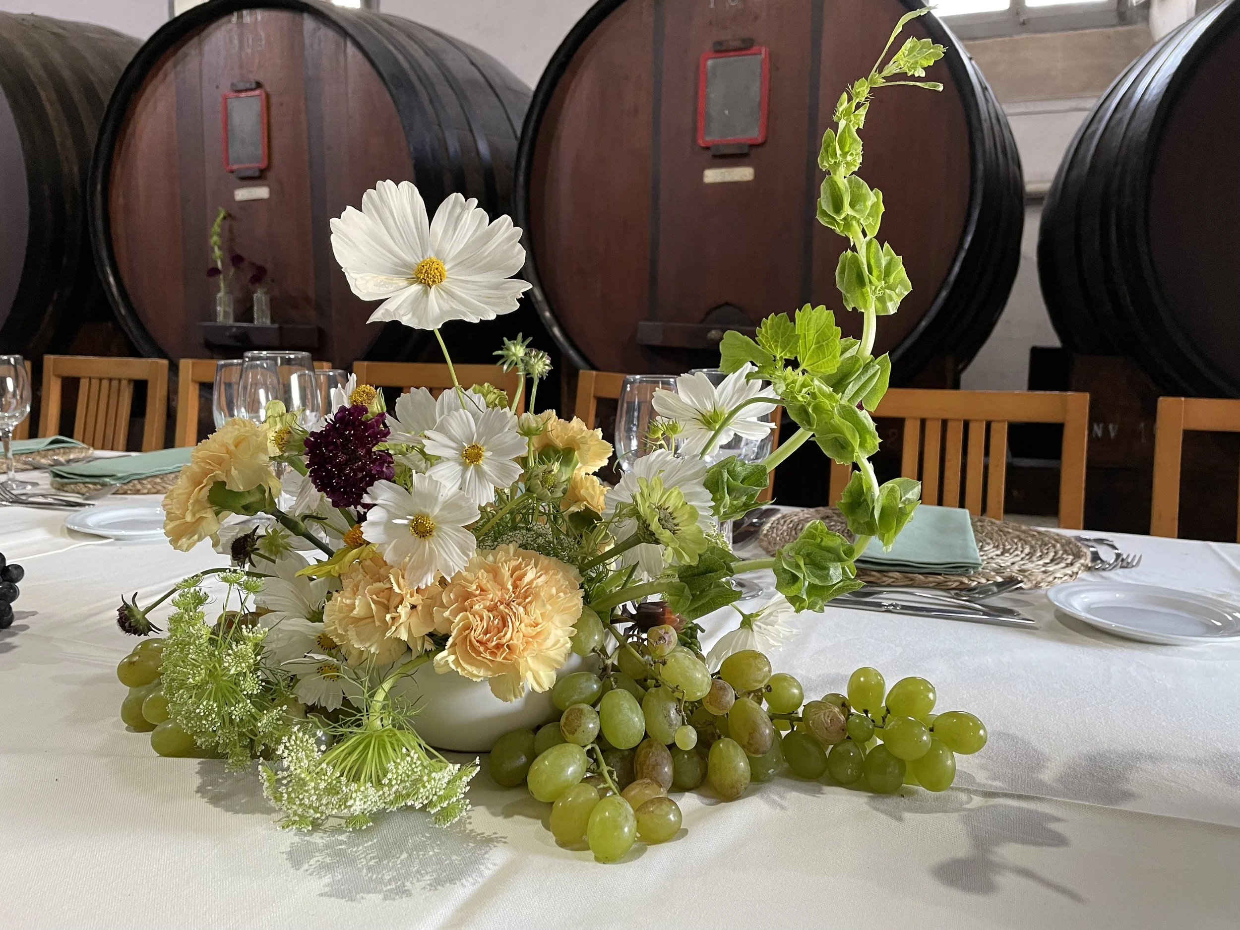 Desenvolvemos uma decoração especial para a ocasião, com arranjos contínuos que percorrem todo o comprimento da mesa, combinando flores campestres com cachos de uvas.