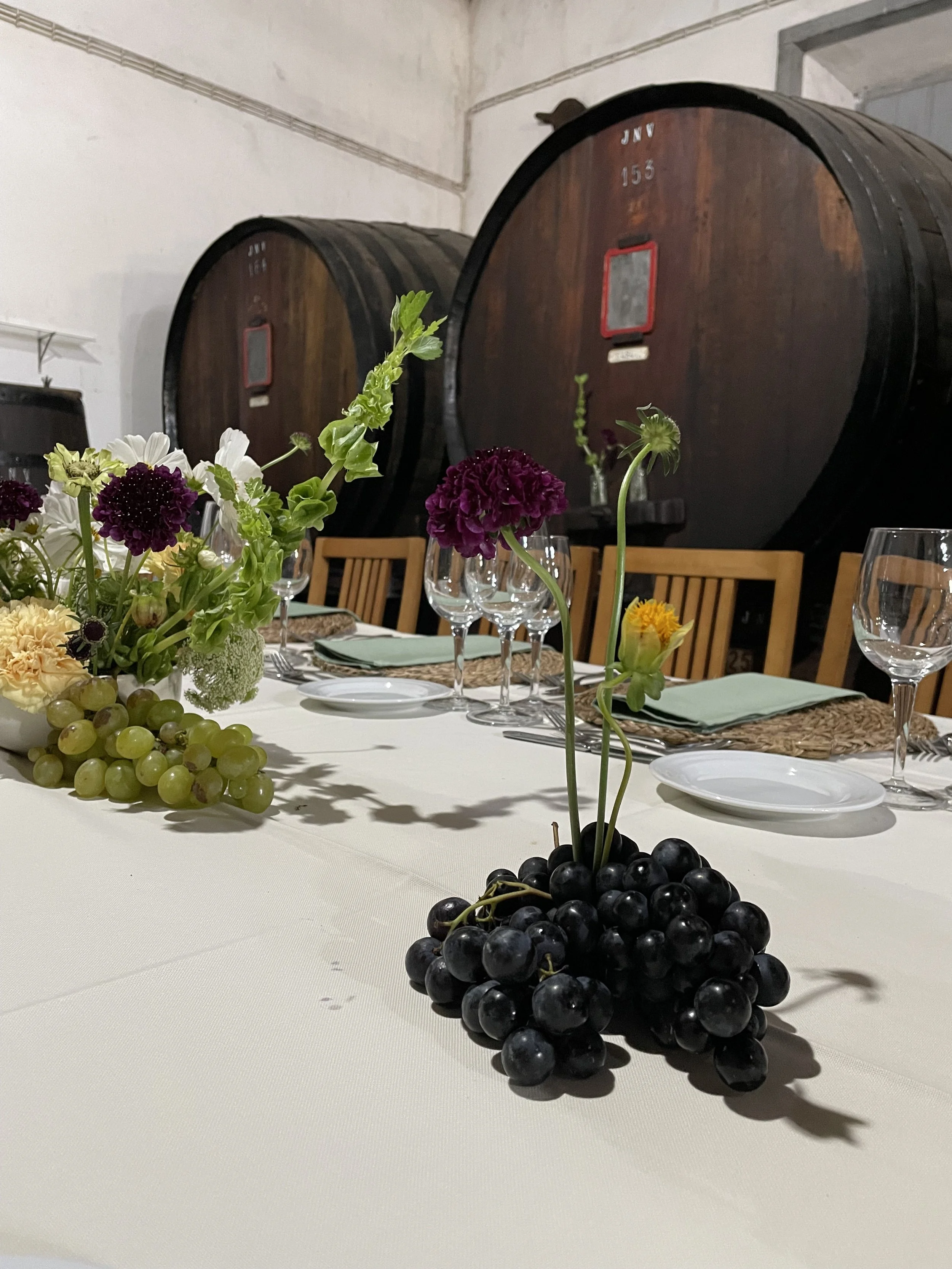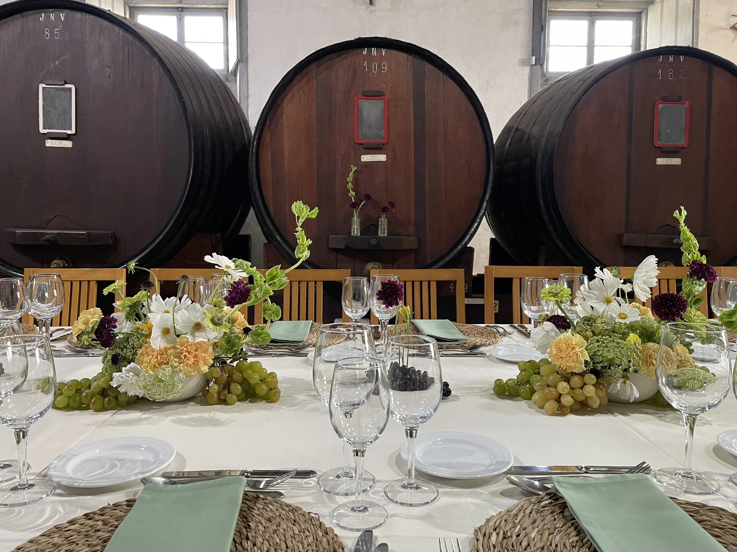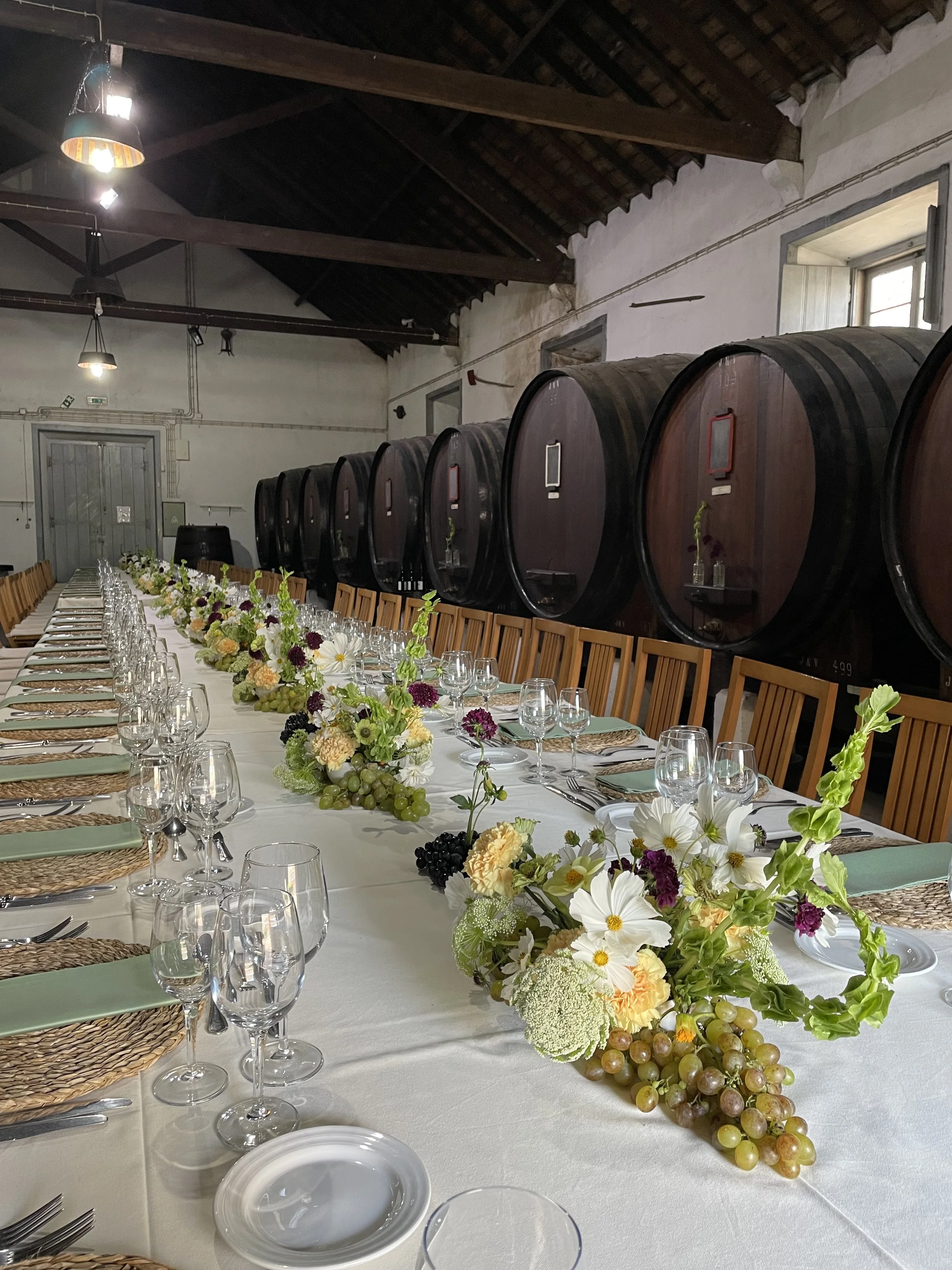 A extensa mesa tornou-se o elemento central da comemoração, estabelecendo uma ligação com os imponentes barris ao fundo do museu. Uma decoração, que une a tradição e a natureza, refletindo na perfeição o ambiente envolvente deste espaço dedicado ao vinho.